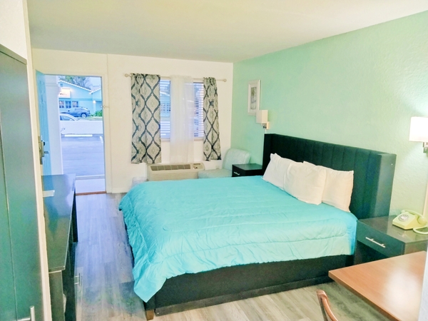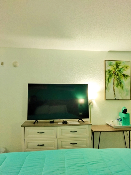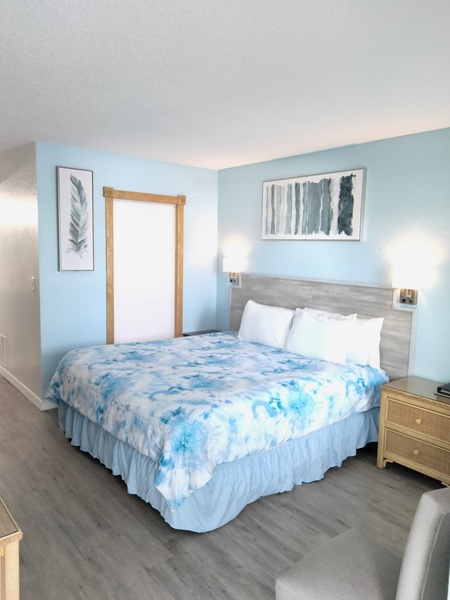 The King room has a One King size bed, microwave, fridge and hairdryer. coffee maker, 55 inc flat screen Roku tv